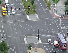 Широкая прерывистая линия дорожной разметки — обозначает границу между полосой разгона или торможения и основной полосой проезжей части. На перекрестках, пересечениях дорог на разных уровнях, в зоне автобусных остановок и т.д. |