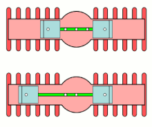 Этот оппозитный двигатель – двухтактный. На рисунке хорошо видно, что в цилиндре находится по два поршня, и закреплены они на одном коленчатом валу (на рисунке они обозначены как красный и синий). Красный обеспечивает впуск смеси, а синий – выпуск продуктов сгорания. Из конструкции подобного оппозитного двигателя исчезла головка блока цилиндров и механизм привода клапанов. Кроме того, достоинством такого оппозитника является то, что поршни работают на один коленвал.