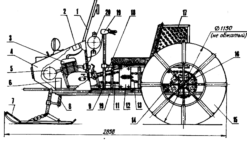 ВП-150М- двигатель — установлен на машине поперек движения, так он занимает меньше места и вентилятор охлаждения при таком расположении двигателя лучше работает. Центральный кронштейн крепления находится на кожухе под самым цилиндром двигателя. Задний кронштейн находится на кожухе передачи, а нижний на блоке моста справа. Топливный бак крепится к картеру двигателя и имеет емкость 5,5 литра, топливо из бака в карбюратор поступает механически. На переднем мосте находится педаль сцепления — слева и педаль газа — справа.Рычаг ручной передачи, к зубчатому стержню приварен шарик, для удобства переключения скоростей. Запуск двигателя происходит от кикстатера. Выхлопная труба находится под сидением. Трансмиссия машины симметрична от осиниковой рамы. Карданный вал с помощью цепной передачи создает крутящий момент. Из прутка выточен карданный вал, имеющий на концах шлицы, а в шейке манжеты уплотнения.