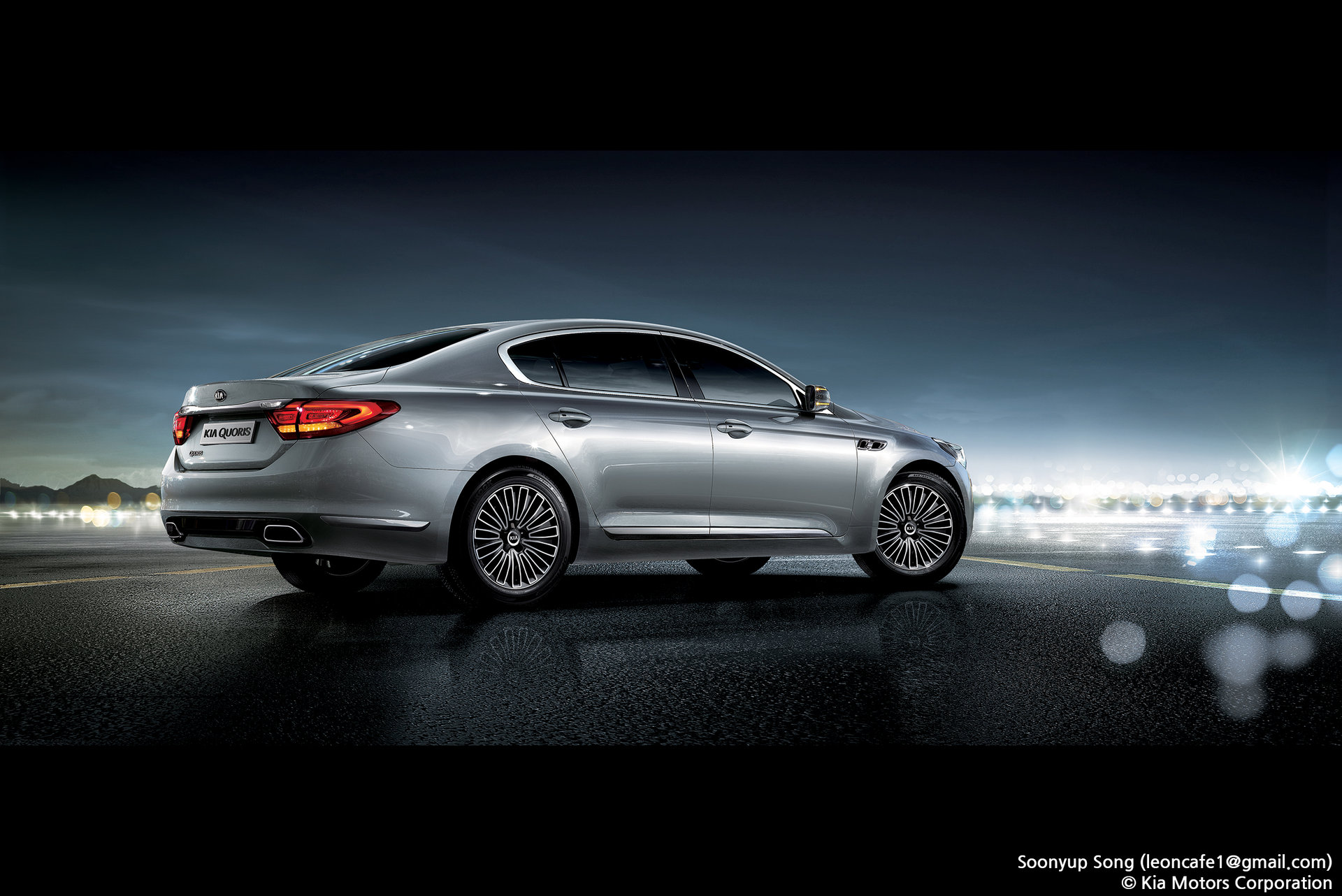 Капот Kia поднят на высоких боковых гранях штамповки, сходится к радиаторной решетке, блоки головного света Quoris установлены под 15-градусным углом, комплектуются парным би-ксеноном. Раструб воздухозаборной системы незначительно расширяется к краям, где встроены полосы светодиодных элементов. Над дверными ручками проходит восходящая грань жесткости, на передних крыльях выполнены компактные воздухозаборники, контур боковых окон подчеркнут хромированной струной. Задние стойки имеют плавный угол склонения, благодаря чему крышка багажного отсека визуально кажется продолжением крыши. Широкие трапециевидные стоп-сигналы на существенное расстояние заходят на боковые поверхности задних крыльев.