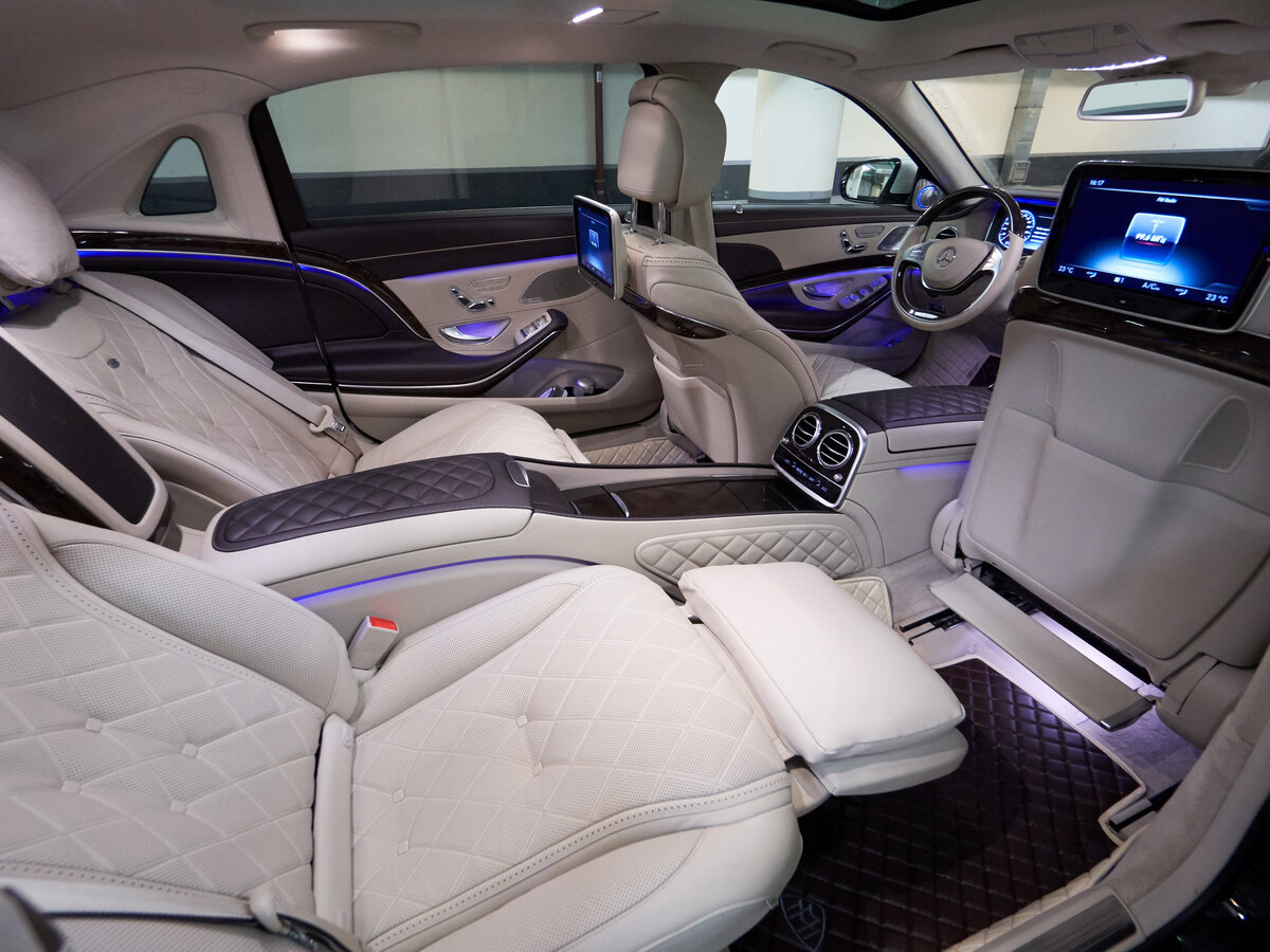 Для удобства в пороги автомобиля встроенная подножка, которая автоматически выдвигается, производится посадку и высадку удобнее. Внутри автомобиля максимальный комфорт для пассажиров и водителя. Раздельные кресла сзади оснащены подогревом, вентиляцией и массажем — как и на седане Mercedes-Maybach S-класса.Наклон спинок регулируется в диапазоне от 27 до 44 градусов.