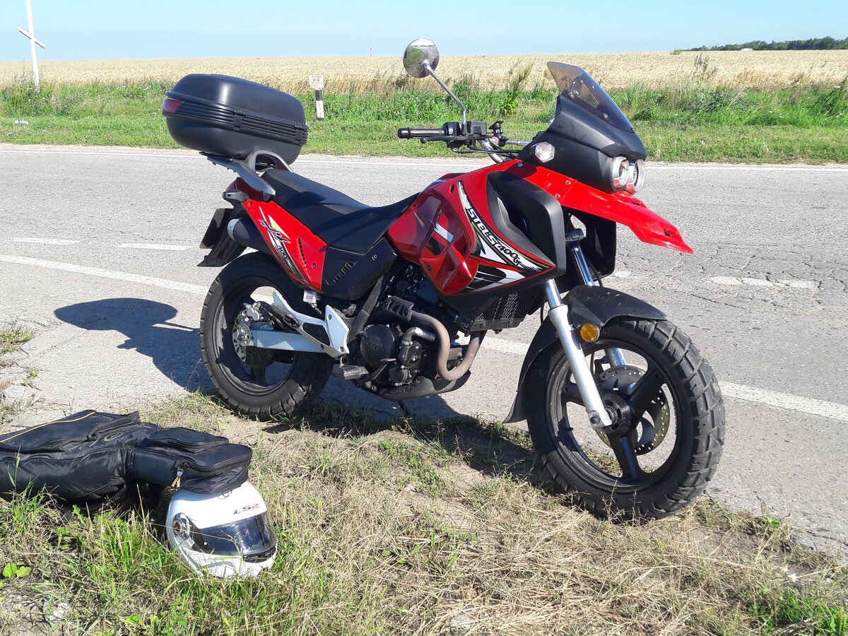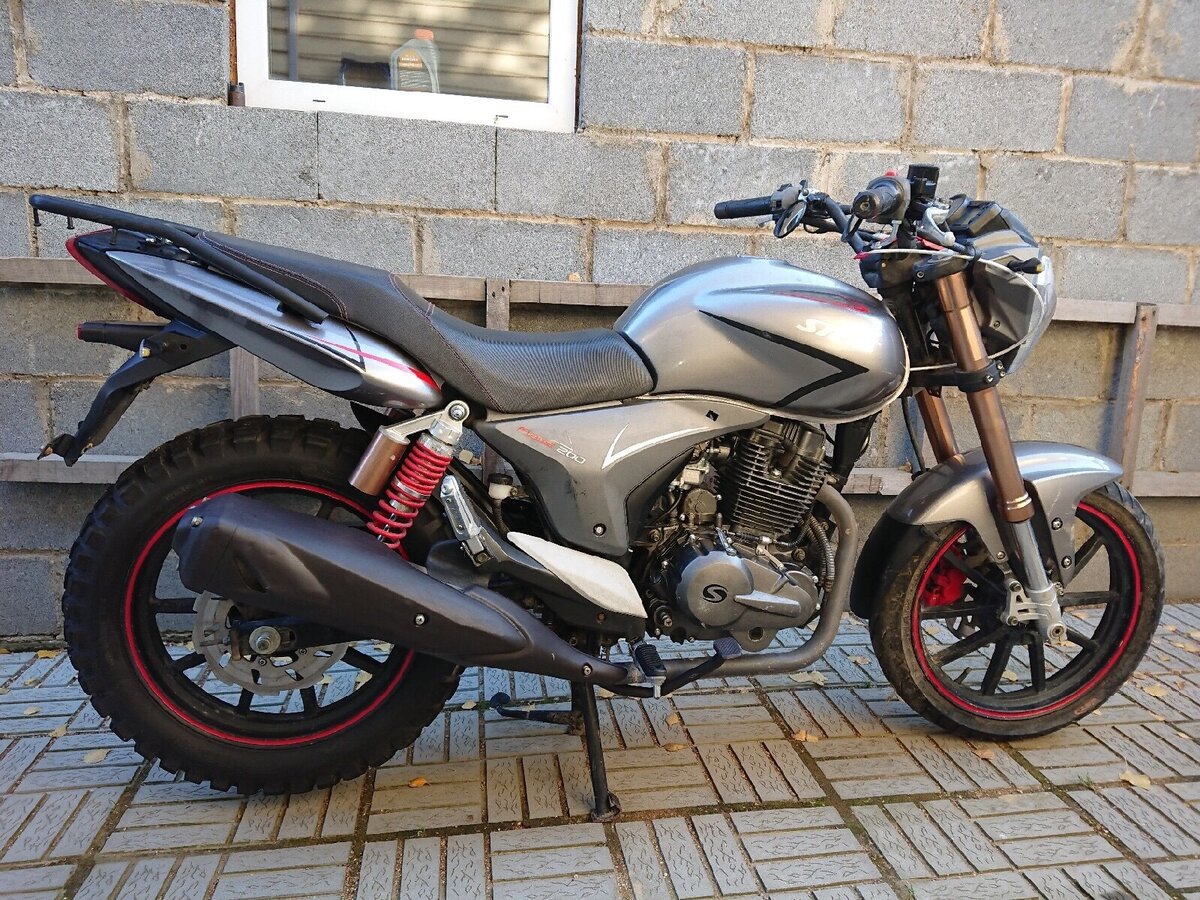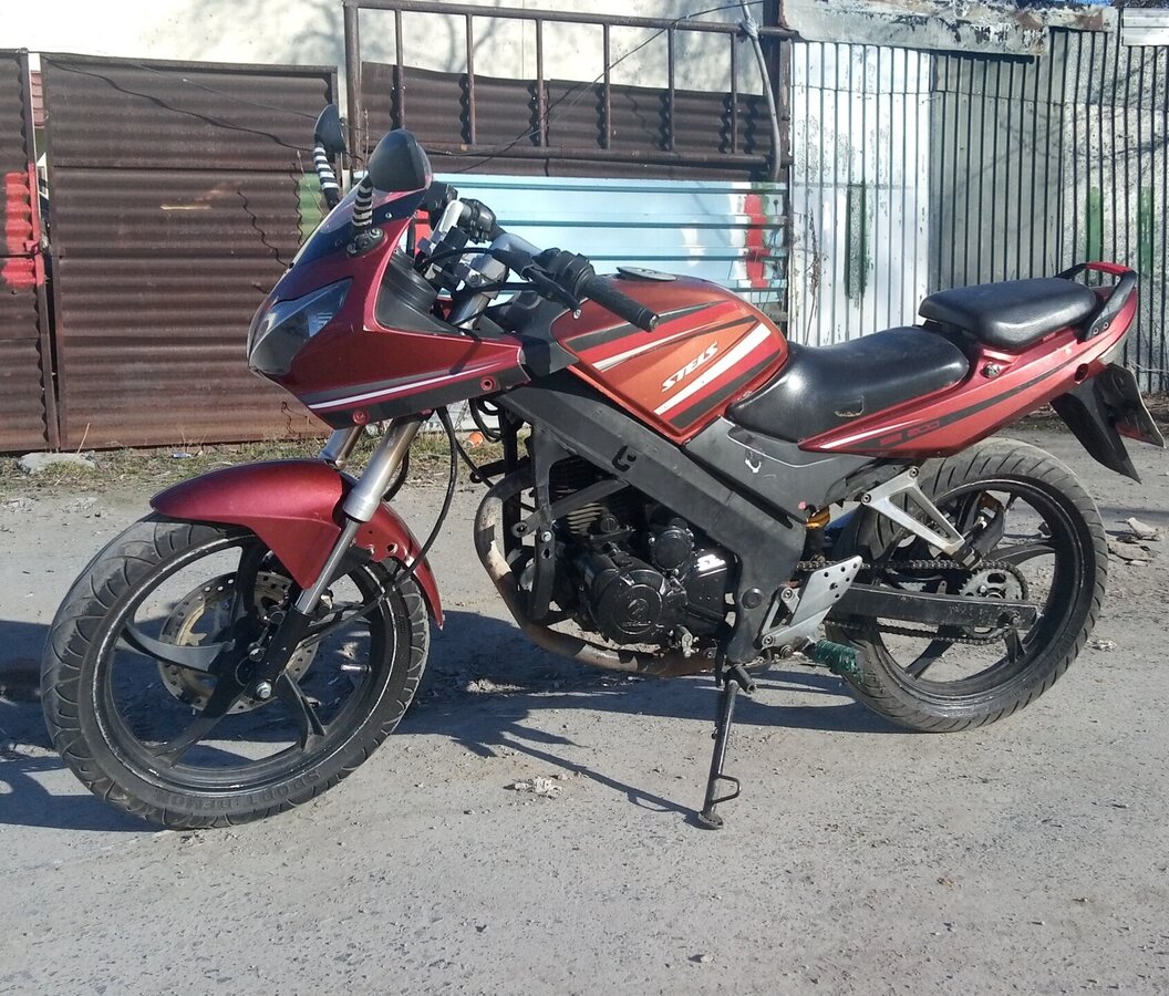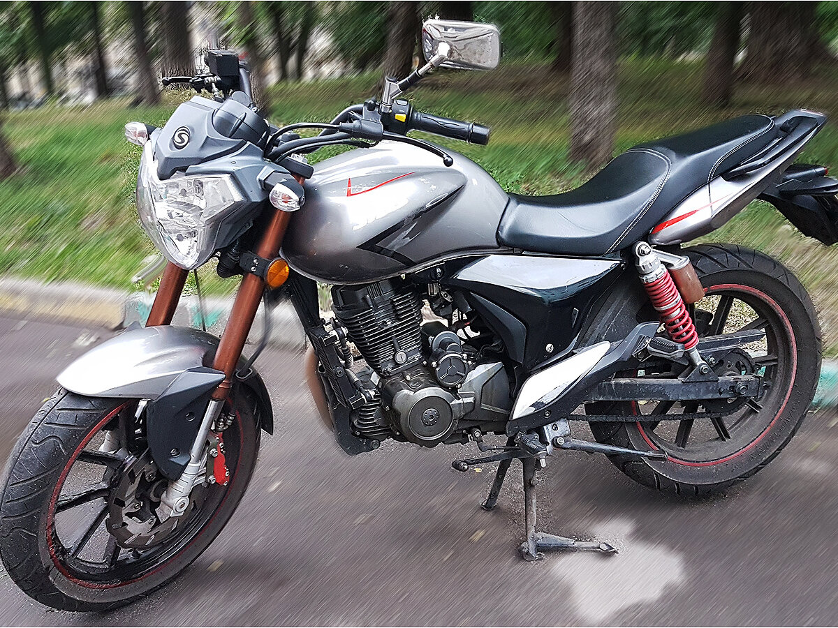 Был у меня данный аппарат год назад, вообщем началось всё с выбора, который наверное встаёт у всех, бу японец или новый китаец. Ну из японцев всем ясно, что кроме Yamaha YBR 125 выбора особо и нет, а вот китая хоть жопой ешь, эндуро, дорожники, чопперы, выбирай что хочешь, да и кубатура за такую цену уже не 125, а 150-200. Долго я ломал голову над тем что выбрать, излазил вдоль и поперёк все авто. ру и авито, а ведь сезон, руки-то чешутся, и тут совершенно случайно, придя в какой-то задрипанный салон увидел его, тогда он мне показался просто идеальным, да ещё и акция на него была, и стоил он вместо положенных ему 65 тысяч, 57. Ну конечно же щенячий восторг, все дела, решил брать. Оформили все бумажки пришли его заводить, а он не в какую, просто крутит стартером и всё. Ну с горем пополам парнишка завёл его, что удивило, мотоцикл который только что еле еле завёлся сразу держал холостые и не глох, я думал будет история как с моей бывшей альфой, там я обычно стоял и держал газ, пока она не прогреется и сама холостые держать не станет, вообщем + стелсу. Ну дальше садимся, продавец говорит что бенза совсем уже нет, надо бы доехать на заправку. Ну что поделать, раз надо так доедем, накидываю шлем и в путь, выезжаю со стоянки, включаю вторую, а нет, не включаю, лапка почему то дальше нейтралки не поднимается, останавливаюсь, пробую ещё раз, с диким усилием, но она втыкается, потом опять на первую разгоняюсь, с дичайшей силой дёргаю ножку, и о чудо, вторая воткнулась, третья включается уже не с таким натугом, но всё равно приходится дико херачить по ножке. Заправив стелс, пробуем с другом регулировать сцепление, вроде бы потом стало получше, но всё равно передачи втыкаются туго. Где-то к 100 км пробега эта фича с тугой ножкой ушла, и слава богу.На 300 км пробега, поменяв масло, довольный еду по делам, неспеша, обкатка же, отвлекаюсь от дороги, ибо 50 тошнить стало уже скучно, потом поворачиваю голову и передо мной уже почти стоит какая-то рено, послав логику куда подальше, выжимаю оба тормоза на максимум, и происходит что-то совсем непонятное, мот делает некое подобие стоппи, из-за узкой говнорезины, в стоппи при угле примерно в 40 градусов на хер блокируется переднее колесо и мот заваливается на бок, ну скольжу значит я на боку, и опять же послав на хер логику пытаюсь встать пока мот ещё скользит, стёр все руки, поцарапал визор, на моте, что странно, поцарапано всё, кроме пластмассы, отвалилась подножка водителя, ну думаю ладно, заварю.