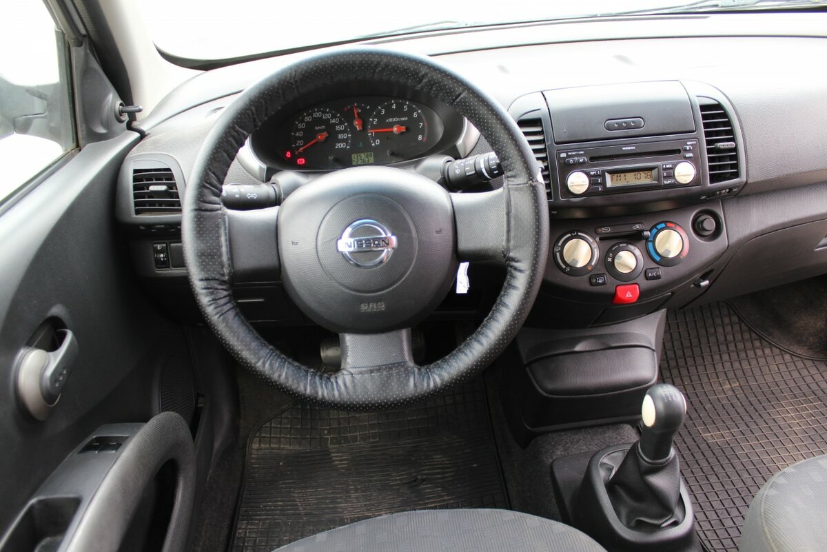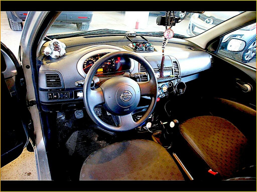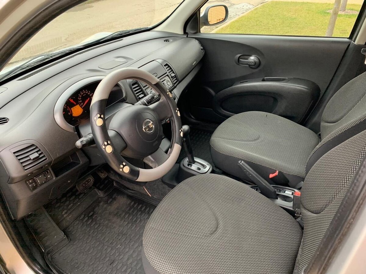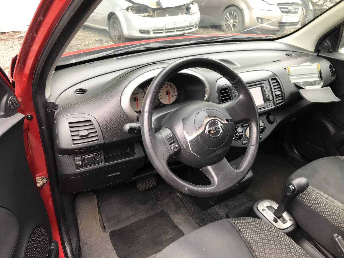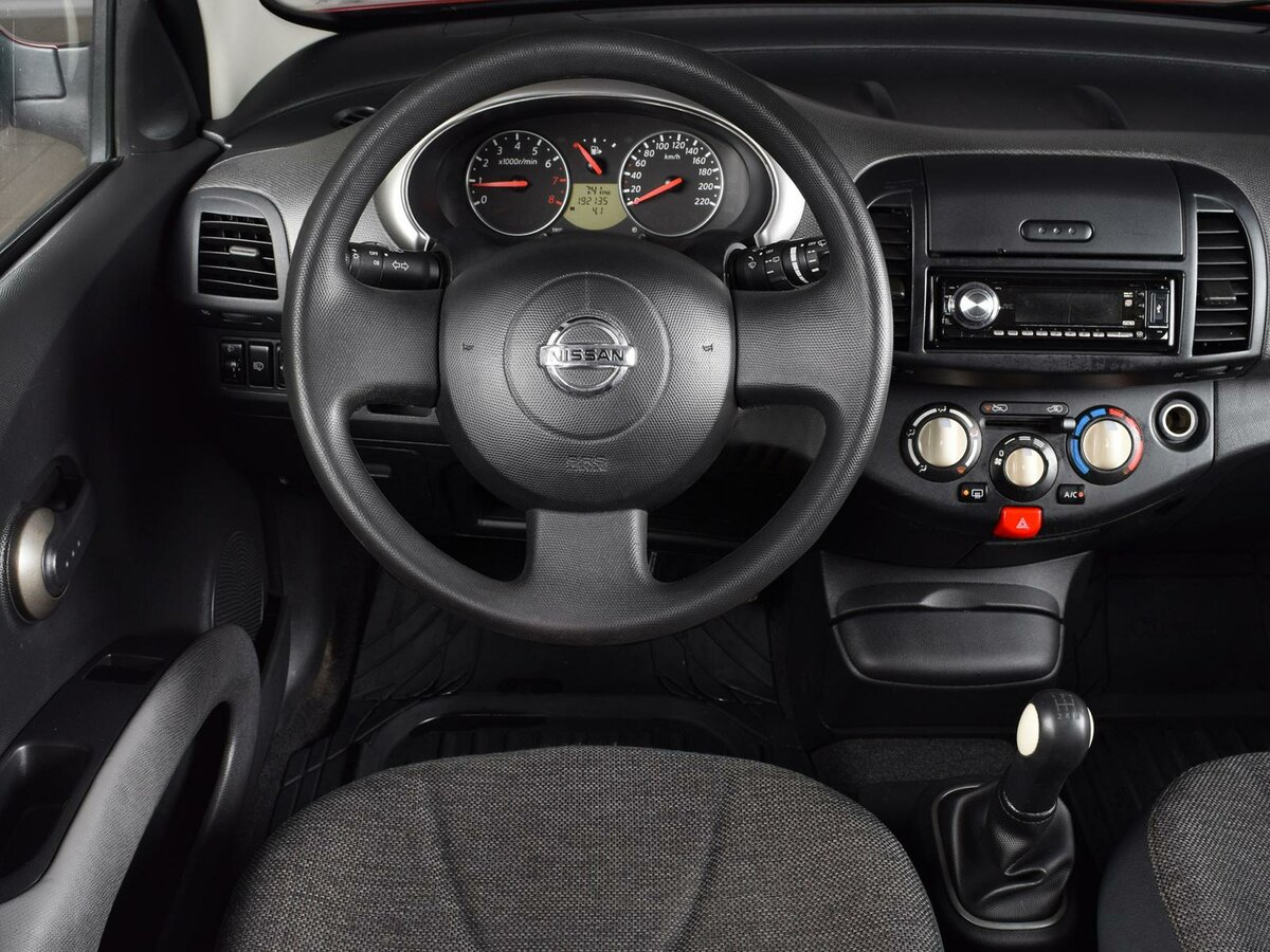 Самого ключа в традиционном понимании этого слова здесь нет — он выполнен в виде брелока. Двигатель же заводится небольшой круглой рукояткой на месте привычного замка зажигания. Интерьер Nissan Micra очень похож на салон соплатформенного «родственника» Nissan Note, отличаясь от него некоторыми деталями. И интерьер отличный! Приятная оригинальная фактура пластика передней панели, лаконичный, но очень информативный приборный щиток, удобный руль с клавишами управления музыкальной системой и стильные «костяшки» климат-контроля — всё сделано очень качественно и радует глаз. Ложка дёгтя в бочку мёда — сиденья без какого-либо намёка на боковую поддержку.