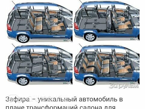 Фронтальную часть передней панели, ручки дверей, подоконную линию Opel обтекают вставки из полированного алюминия, боковая поддержка кресел, центральный подлокотник Zafira обшиты натуральной кожей. Все кресла оборудованы системой трансформации, которая в качестве дополнительной опции интегрируется с сервоприводом.