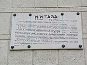 - Мемориальная доска на здании Дворца культуры имени И. И. Газа. 1957 год. Архитектор: Егоров М. Ф., материал — мрамор.