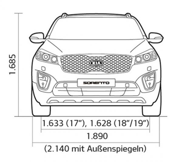 В целом, Sorento 2015-2016 модельного года возмужал и увеличился в размерах по сравнению со вторым поколением, стал выглядеть более солидно и представительно. По габаритам автомобиль получился длинее, шире и чуточку ниже своего предшественника. Длина составляет 4 780 мм (+ 95), колесная база увеличилась на 80 миллиметров – до 2 780, ширина составляет 1 890 (+ 5), а высота сократилась до 1 685 (- 15 мм). Колея передних колес — 1628 мм, колея задних колес — 1639 мм. Клиренс версии для европейского рынка составляет 185 мм (вероятно, такой же дорожный просвет будет и в России).